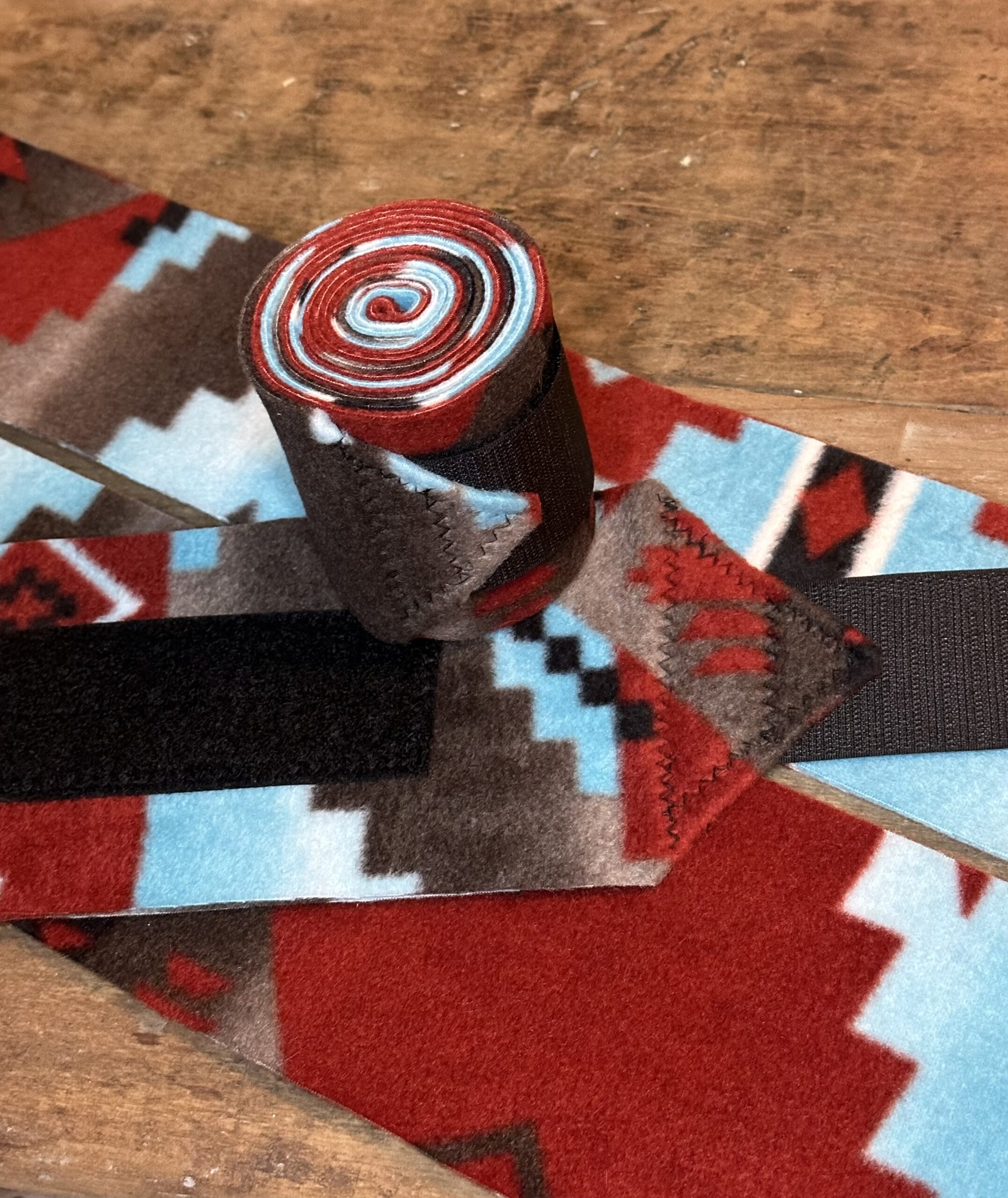 Set of fleece leg wraps with velcro closure. Two 4 1/2″ x 72″ back leg wraps and two 3 1/2″ x 72″ front leg wraps per set. $18 per set local pickup. Shipping available for an additional charge.